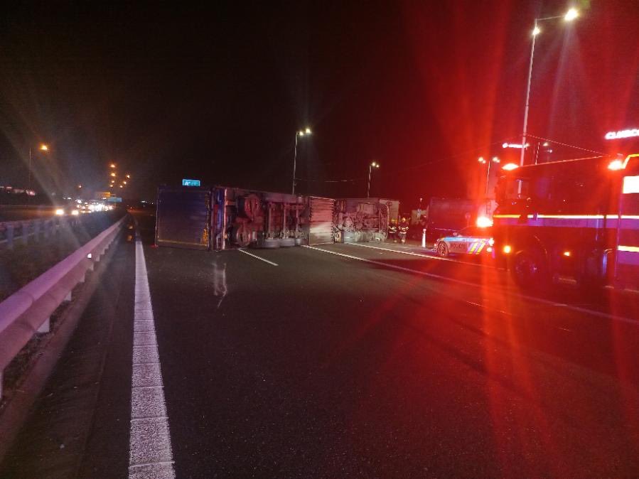 Vážná nehoda na D1 u Prahy. Převrátil se kamion, dálnice byla večer uzavřená